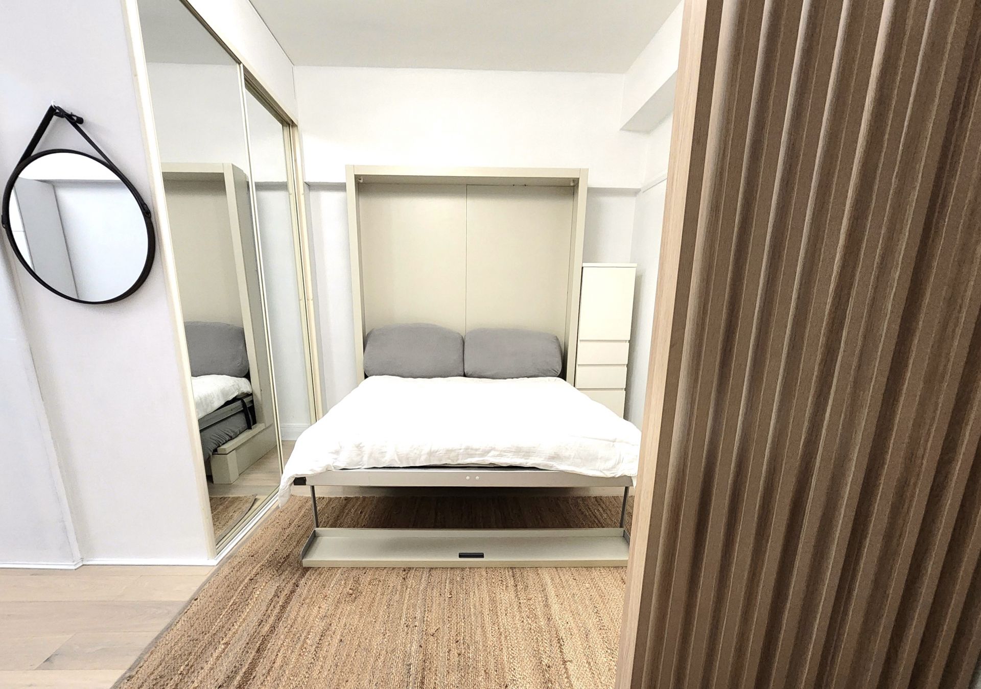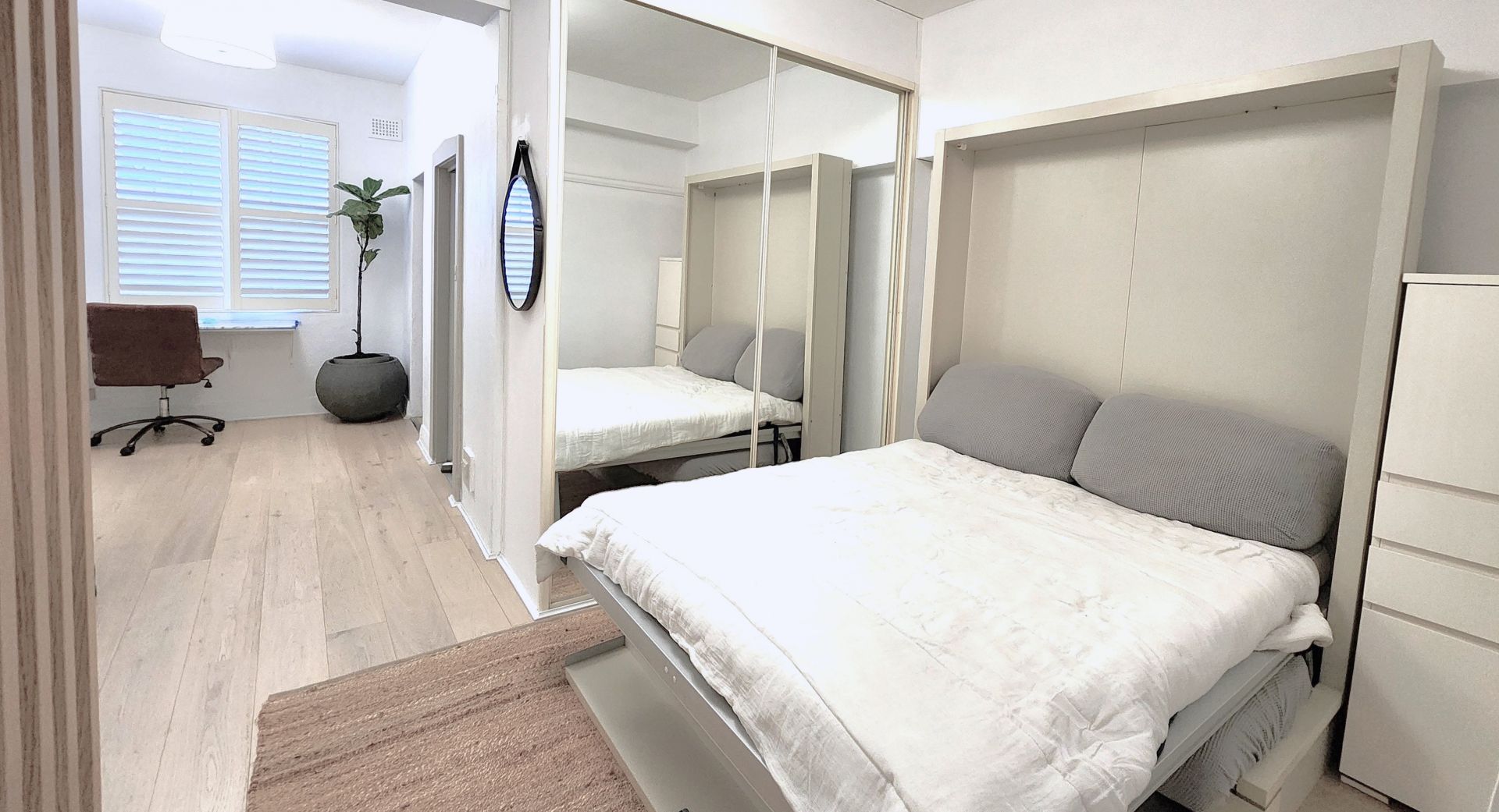 - Spacious sleeping area with fold down bed and built-ins