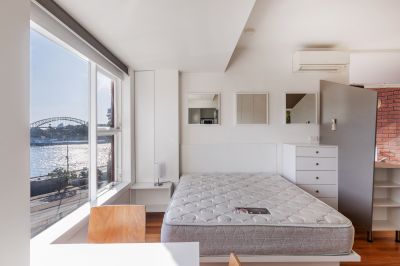 Set at the rear of the building with level access, the apartment enjoys a peaceful setting while showcasing sweeping views across Woolloomooloo, The Domain, the City skyline and Harbour Bridge. Bathed in natural light, the interiors feature high ceilings, polished timber floorboards, and contemporary finishes designed for both comfort and style.